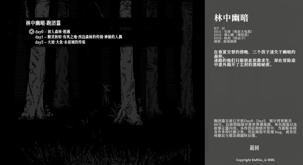 - 迷失于林中之人,会找到属于自己的归途吗?- 完整全剧情流程开发中!- 《林中幽暗·跑团篇》- Replay / 视觉小说 / 原创TRPG规则- 在春夏交替的傍晚,三个孩子迷失于幽暗的森林。 迷路的他们只能彼此依靠求生,却在冒险途中意外揭开了尘封的黑暗秘密。- 持续更新中,页面密码:1234